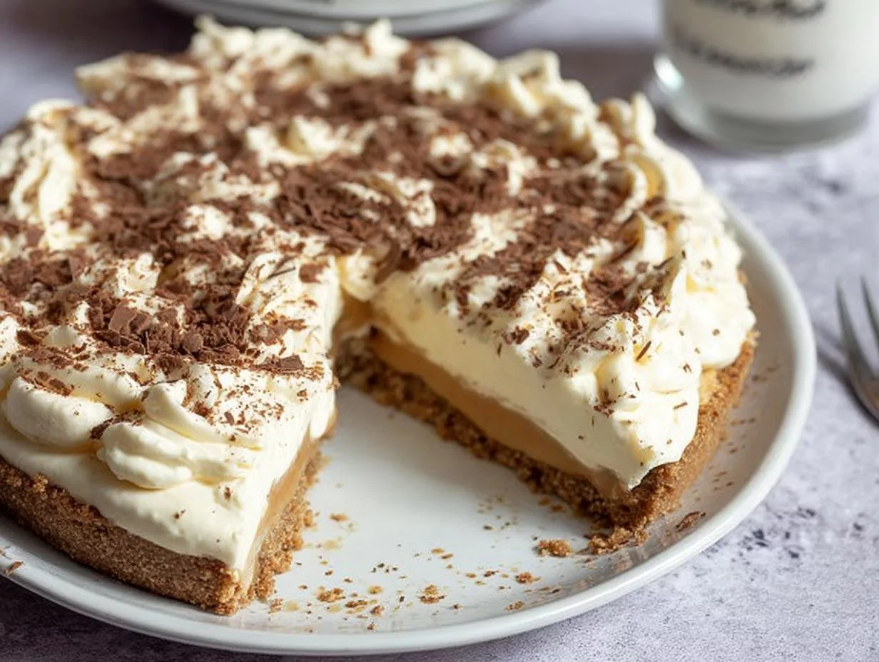 A delicious Banoffee Pie with a biscuit base, rich toffee layer, fresh bananas, and whipped cream topping.