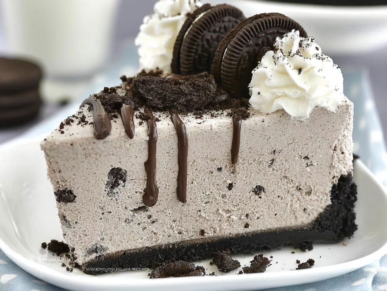 A rich and creamy no-bake Oreo cheesecake with a crunchy cookie crust, topped with whipped cream and more Oreos.