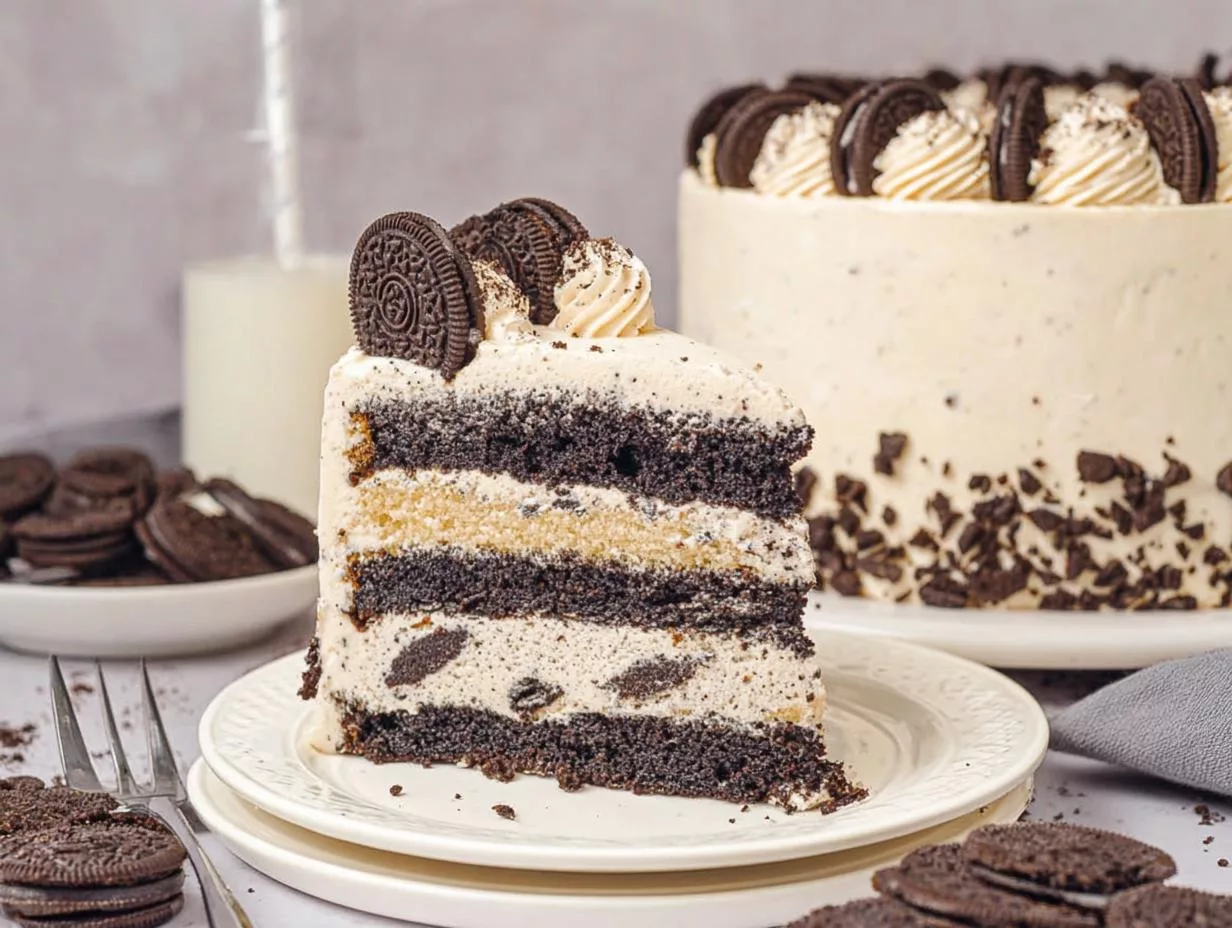 A delicious Oreo cake with layers of moist vanilla cake filled with chopped Oreos, frosted with creamy buttercream, and decorated with Oreo crumbs.