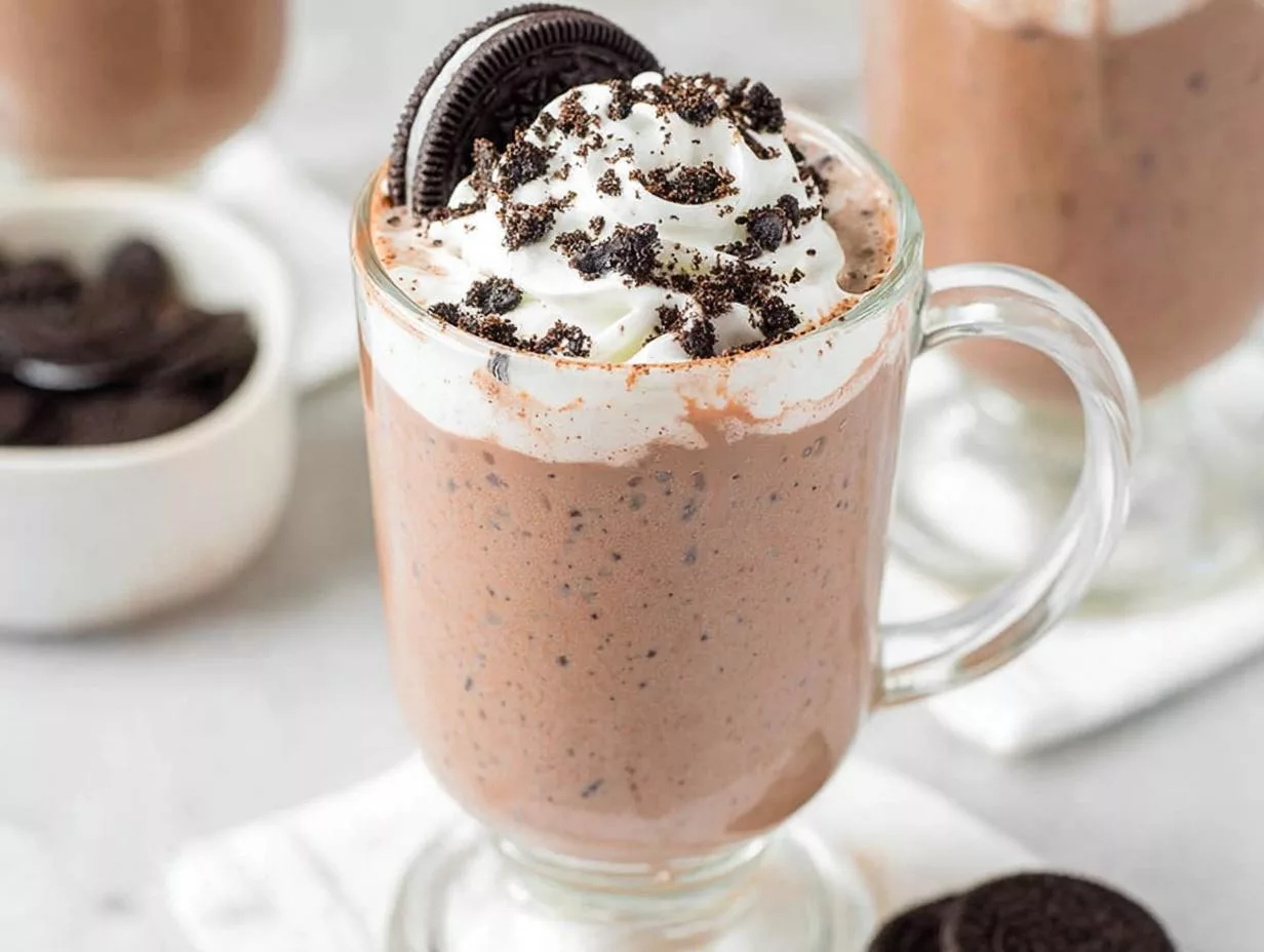 A rich and creamy hot chocolate infused with the classic taste of Oreo cookies, perfect for a cozy treat.