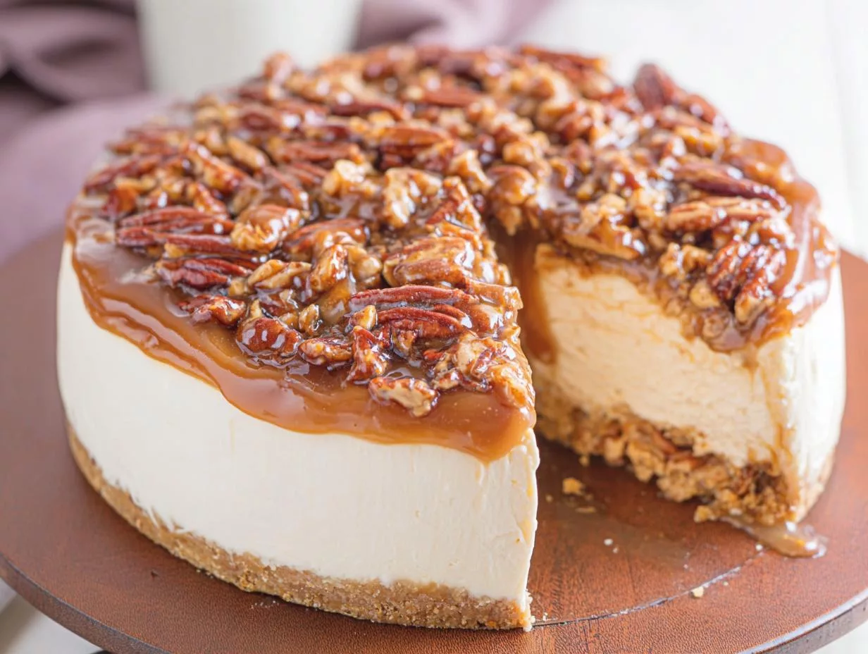 Can I make this ahead? You bet! The cheesecake itself keeps beautifully in the fridge for up to 2 days before adding the topping. Just wait to add the pecan caramel until serving time for that perfect glossy finish.