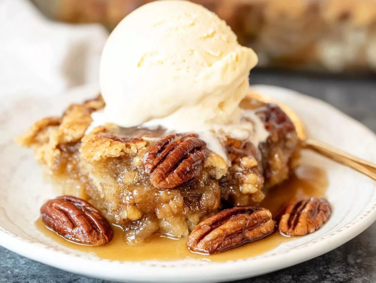A delicious pecan pie cobbler with a rich, buttery crust and sweet pecan topping.