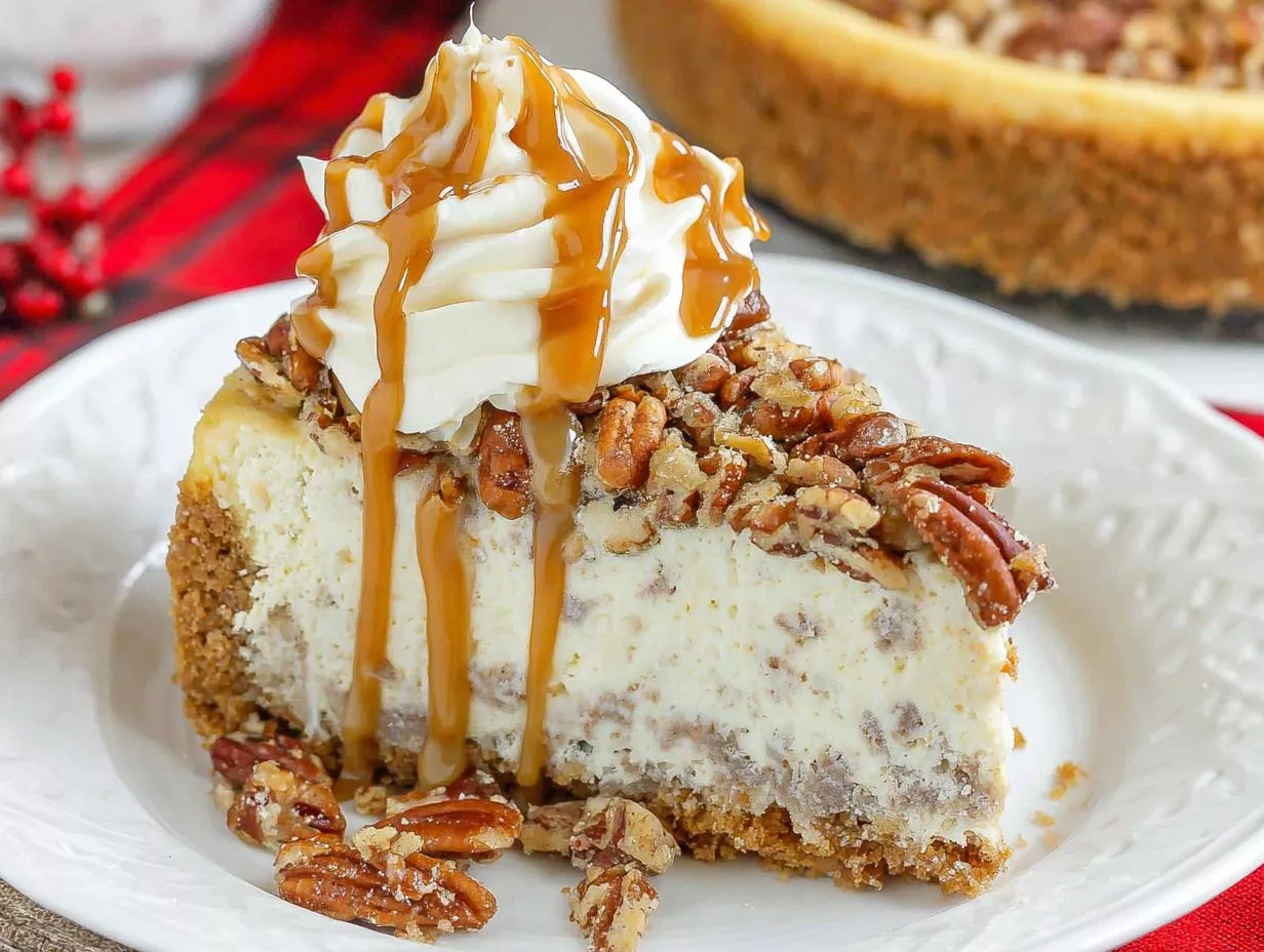 - Pipe whipped cream on cheesecake. Garnish with pecans and caramel sauce.