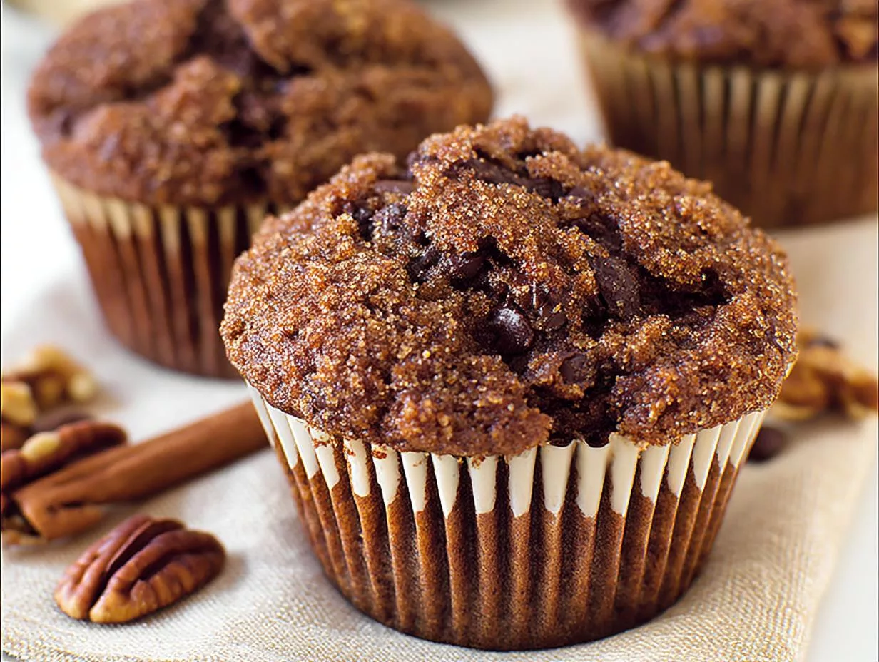 Delicious buttermilk chocolate muffins topped with a sweet pecan and chocolate chip mixture.