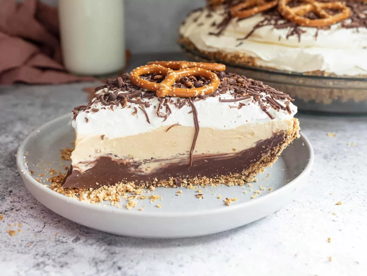 A decadent Chocolate Peanut Butter Pretzel Pie featuring a crunchy pretzel crust, rich chocolate ganache, creamy peanut butter filling, and fresh whipped cream topping.