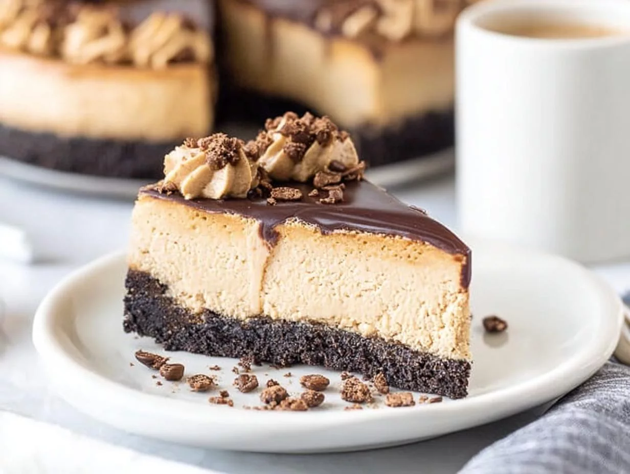 A rich and creamy coffee cheesecake with an Oreo crust, topped with chocolate ganache and optional coffee whipped cream.