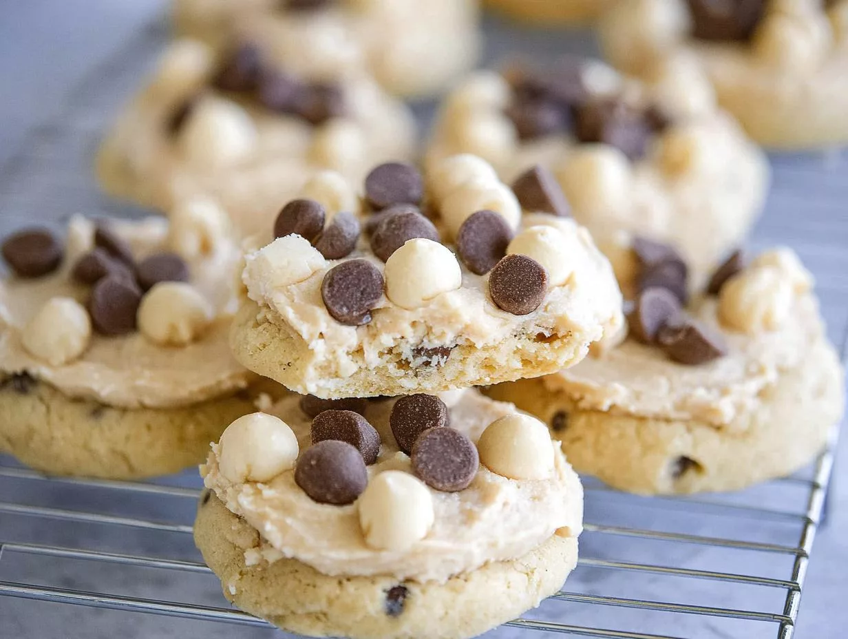 Delicious cookie dough cookies topped with creamy frosting and edible cookie dough.