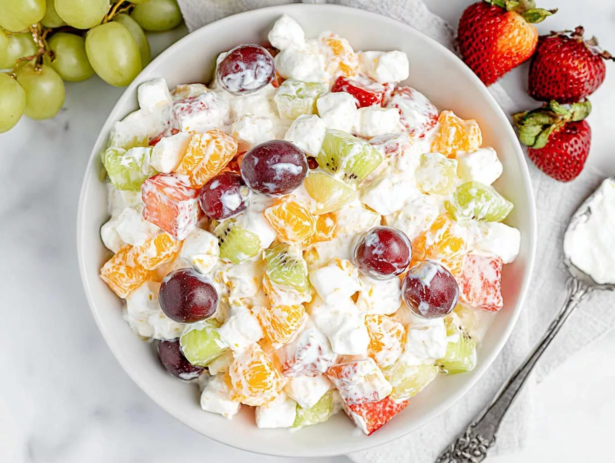 A refreshing and creamy fruit salad with a hint of vanilla pudding, perfect for gatherings or desserts.