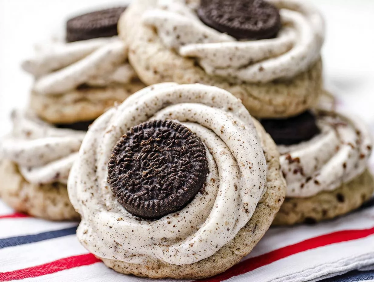 Now for the grand finale! Pipe or spread about 1-2 tablespoons of frosting onto each cooled cookie. I use a star tip for bakery-style swirls, but a knife works just fine. Top each with a mini Oreo – press it gently so it sticks. The hardest part? Waiting 10 minutes before devouring so the frosting sets slightly. But hey, I won’t judge if you sneak a bite sooner!