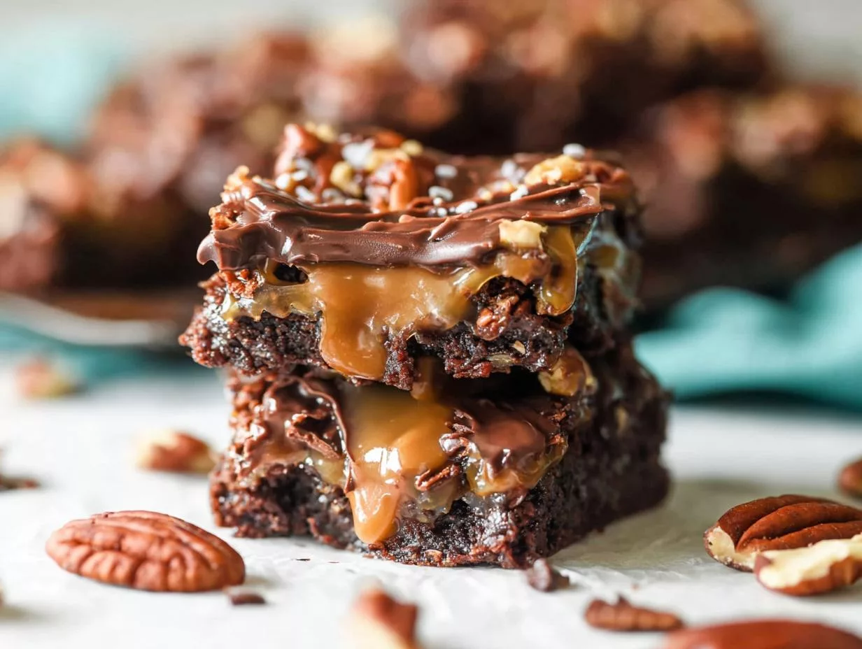 Rich and fudgy brownies topped with homemade caramel, pecans, and a chocolate drizzle.