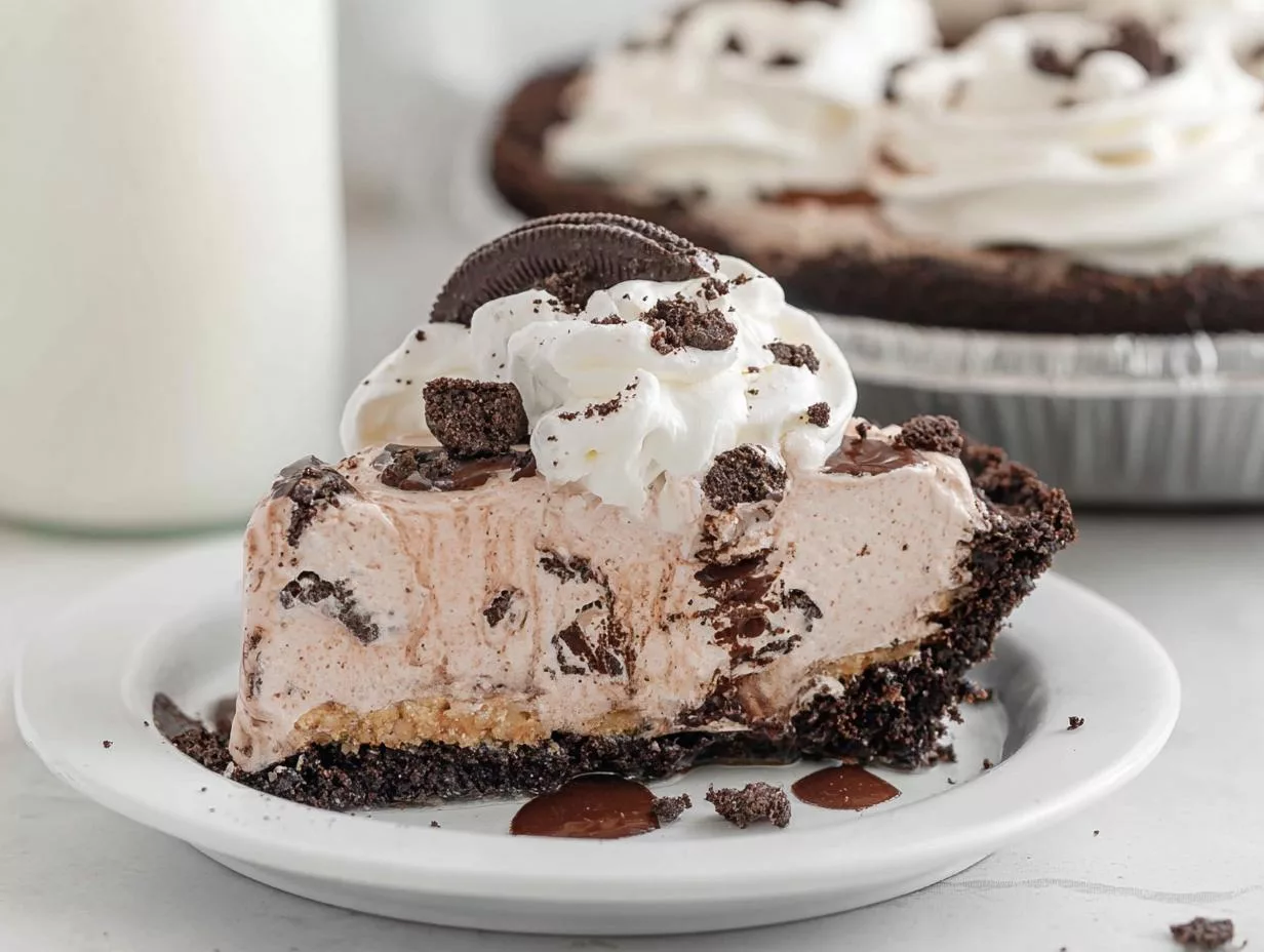 A delicious and easy-to-make ice cream pie with a crunchy Oreo crust, layers of cookies and cream ice cream, chocolate sauce, and whipped topping.