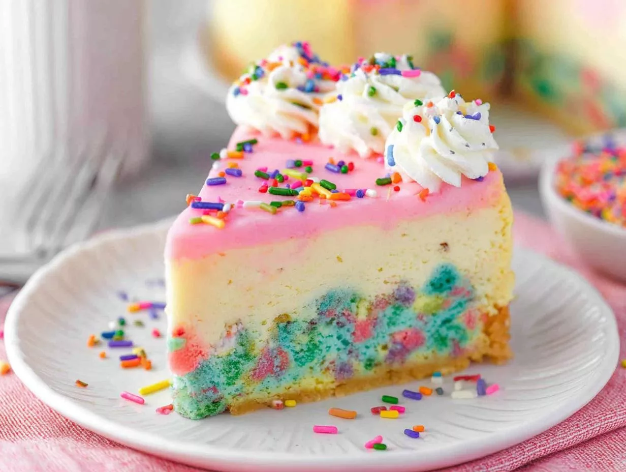 A colorful Funfetti Cheesecake with a soft vanilla cake base, creamy cheesecake filling, and whipped cream topping.