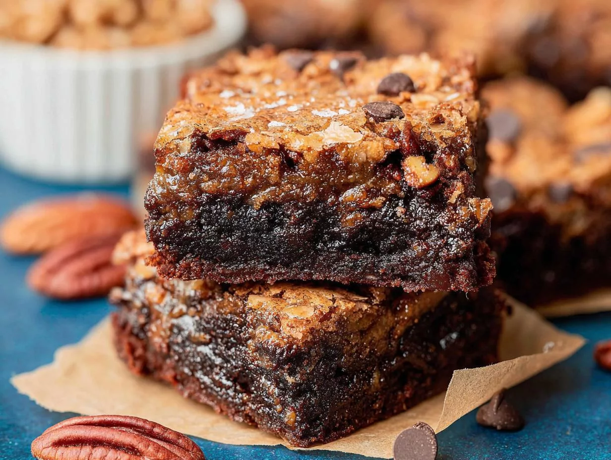 Rich brownies topped with a gooey pecan pie layer, combining two classic desserts into one irresistible treat.
