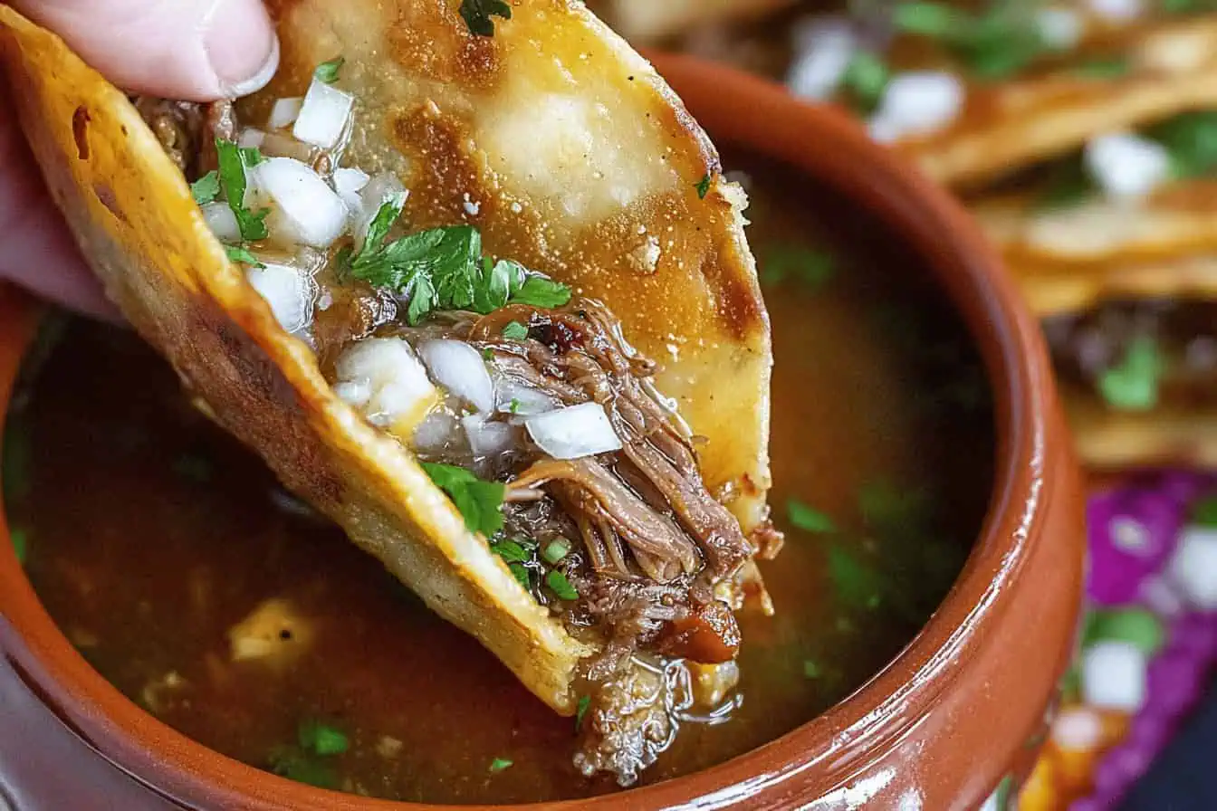 This one is a quick fix when you don’t wanna fuss too much. Take two corn tortillas, pile on generous shredded birria and shredded cheese, fold ‘em, and cook on a skillet with a little oil until crisp and golden on each side. Dip in the birria broth for that extra oomph—you’ll feel like you’re dining at a street taco stand in Tijuana. It’s cheesy, juicy, and totally addictive. Pro-tip: if the tortillas tear (ugh, happens to me), just fold another one over and call it a quesabirria tower. No one’s gonna complain with this glorious mess on their plate.