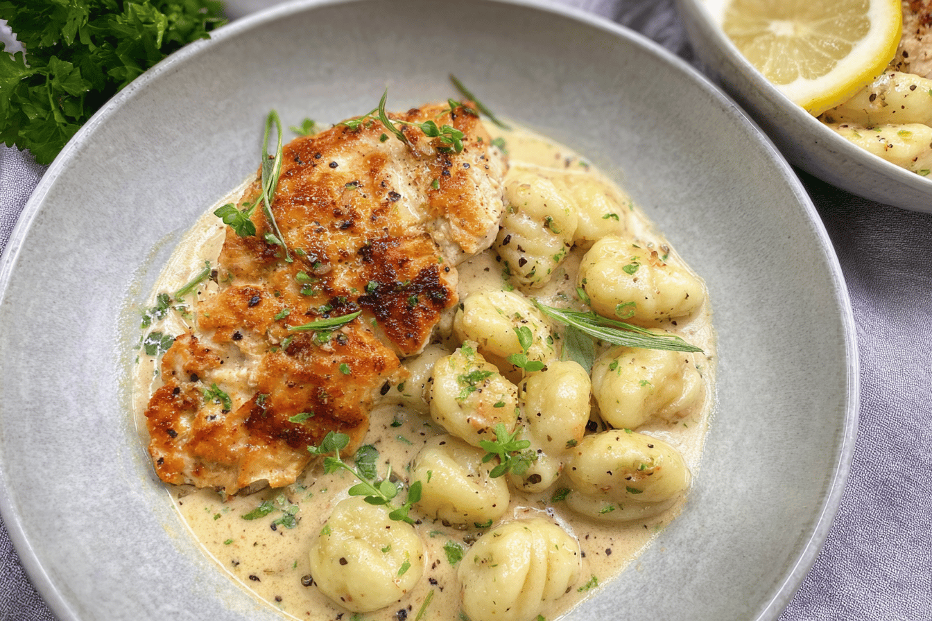 Return the cooked chicken breasts to the pan to warm through for a minute or two. Taste the sauce and adjust seasoning with salt and pepper as needed. Serve the chicken alongside or on top of the creamy lemon gnocchi, garnishing with extra grated parmesan if desired.