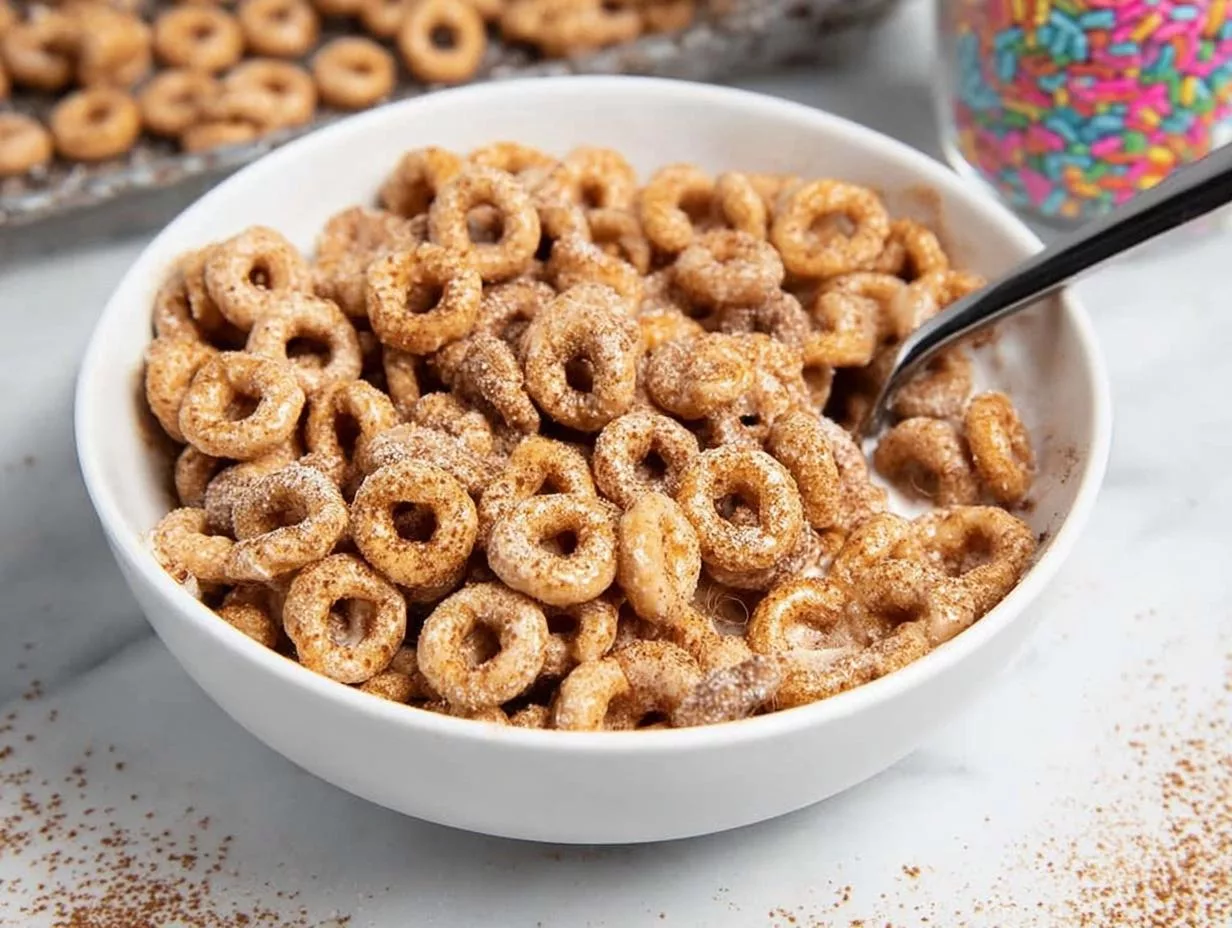 A sweet and crunchy snack made with toasted Cheerios coated in cinnamon sugar.