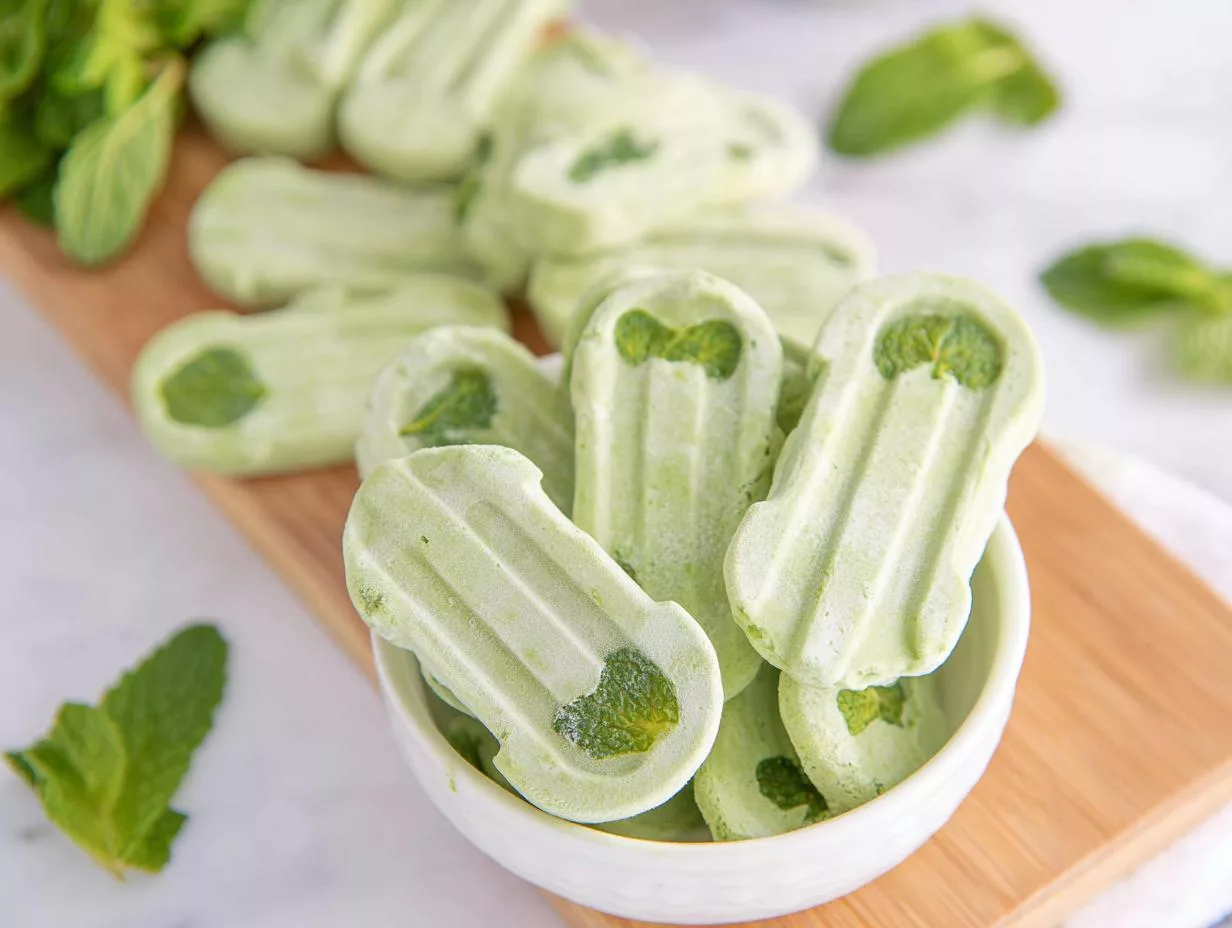 A refreshing frozen treat for dogs made with mint, parsley, spinach, and yogurt.