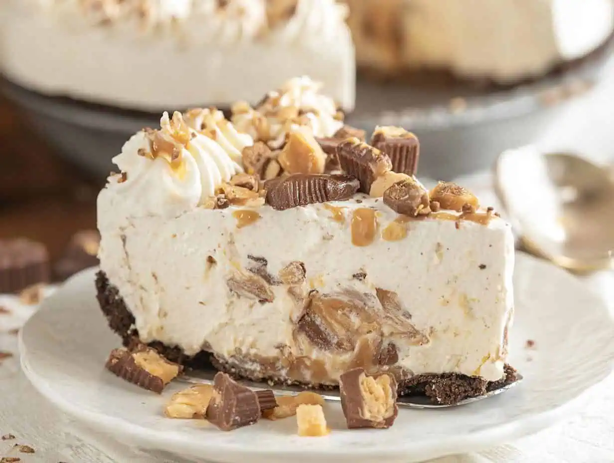 - For the whipped cream garnish, whip together 1 cup heavy whipping cream and 1/4 cup powdered sugar until stiff peaks form. Pipe or layer it on top of the pie and garnish with chopped candy bars.