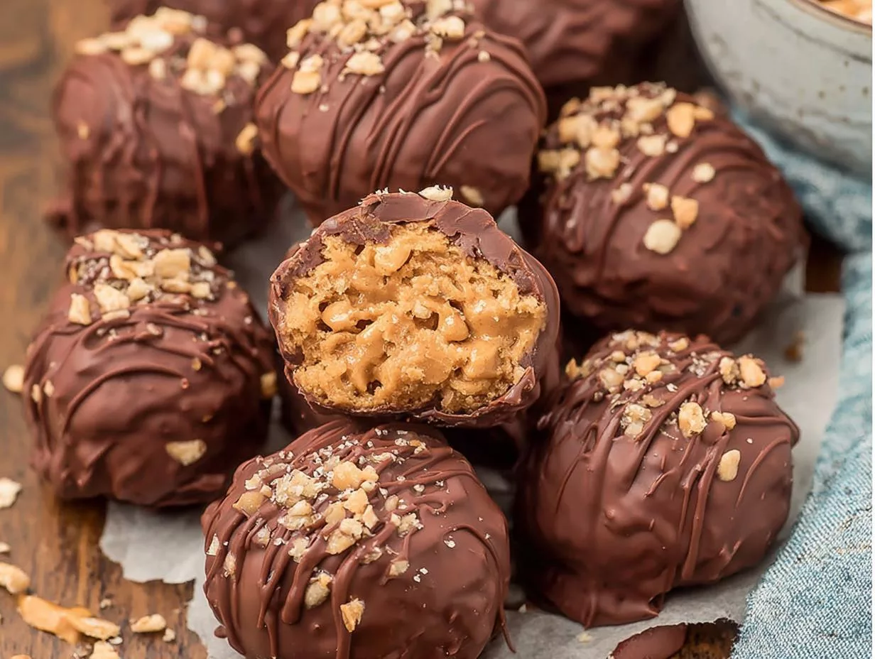 A simple and delicious recipe for peanut butter balls with Rice Krispies, coated in chocolate.