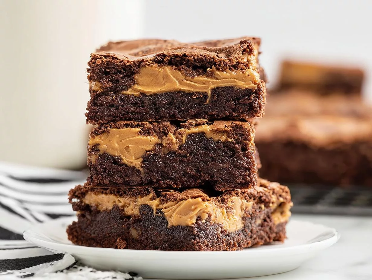Fudgy and chewy peanut butter brownies with a rich chocolate base and swirled peanut butter topping.