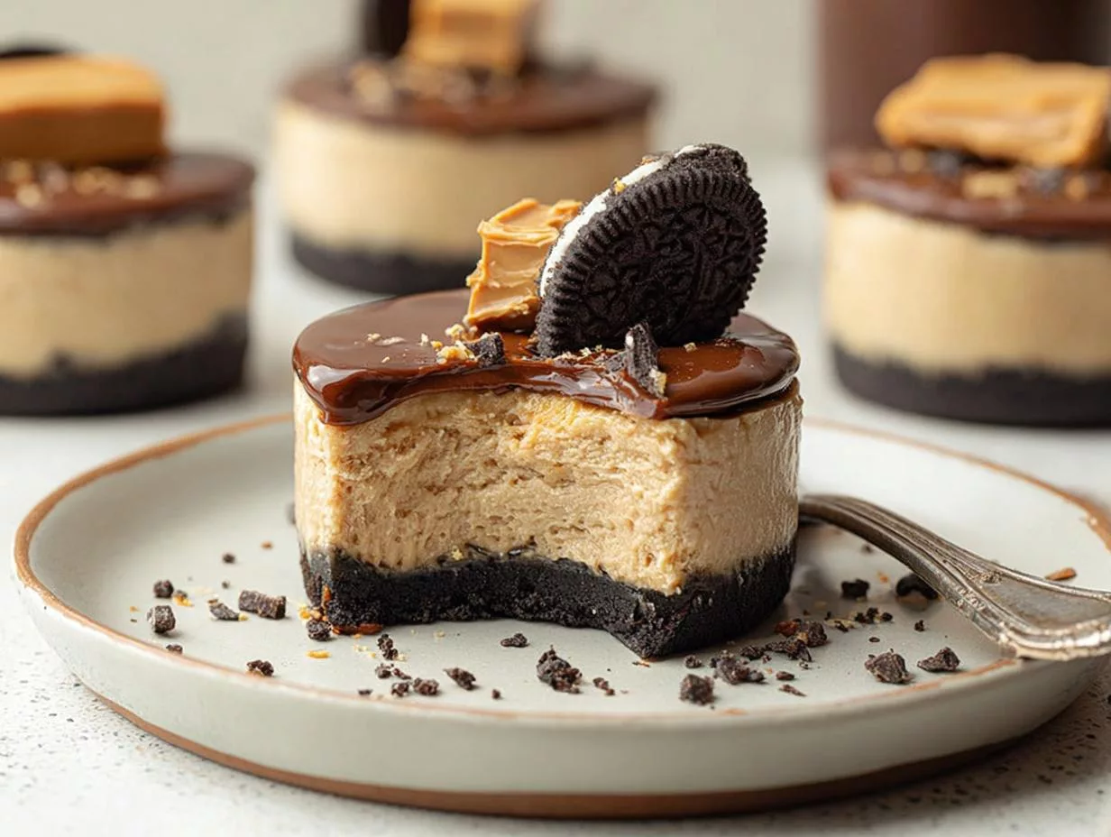 Delicious bite-sized peanut butter Oreo cheesecakes topped with chocolate ganache and mini peanut butter cups.