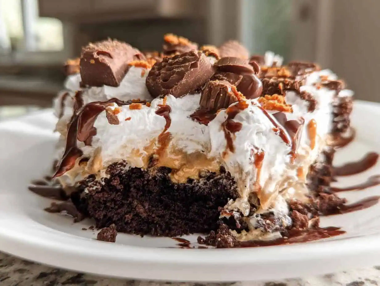 Now it’s assembly time! Take your chilled cake out of the fridge and use a wooden skewer or a straw to poke holes about an inch apart all over the surface. This is where all that delicious filling will soak in! Pour the peanut butter filling over the holes, spreading it evenly. Pop the cake back into the fridge for about an hour to let those flavors meld together. Finally, frost the cake with the thawed Cool Whip and drizzle chocolate syrup on top. Sprinkle those chopped Reese’s over everything, and you’re ready to slice and serve!