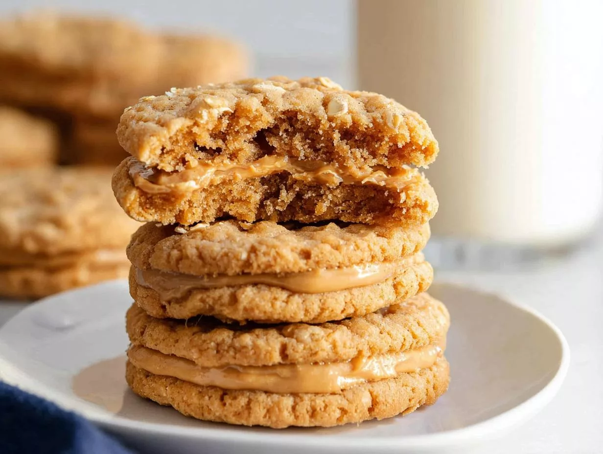 Delicious peanut butter oatmeal cookies with a creamy peanut butter filling, perfect for sandwiching together for a sweet treat.