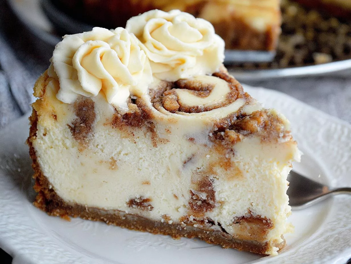 A rich and creamy cheesecake with a cinnamon roll twist, featuring a graham cracker crust, cinnamon swirl filling, and cream cheese frosting.