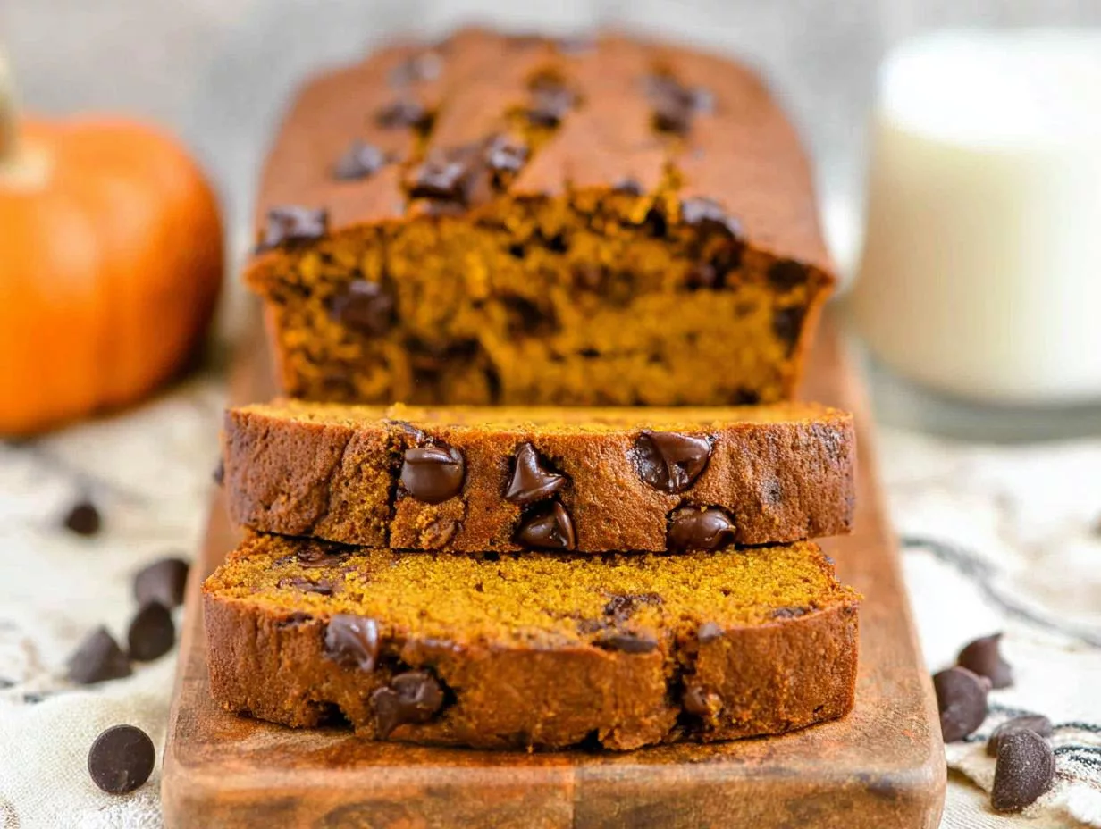 A moist and flavorful pumpkin bread packed with chocolate chips, perfect for fall or any time of year.