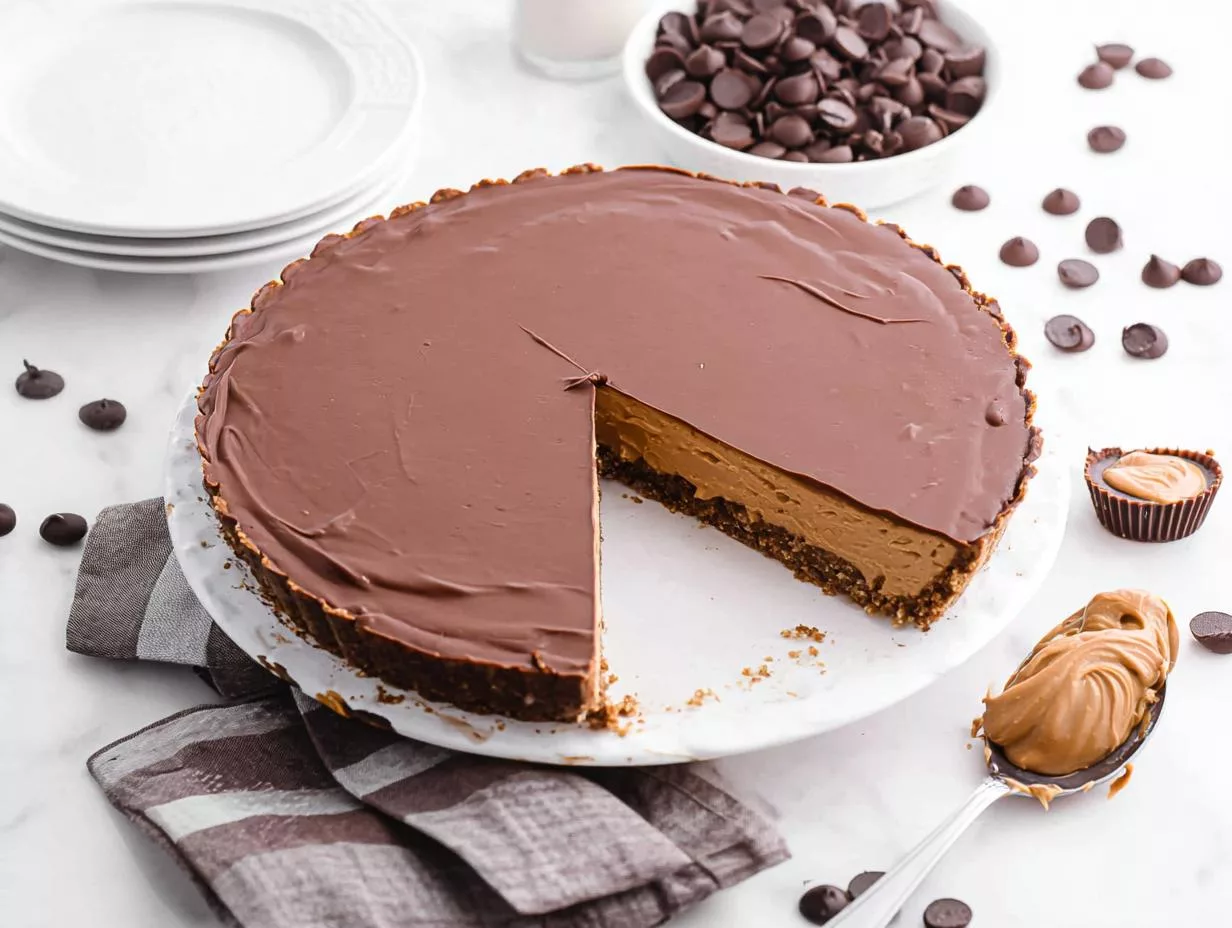A rich and decadent Reese’s Peanut Butter Cup Pie with layers of chocolate ganache and chunky peanut butter filling.