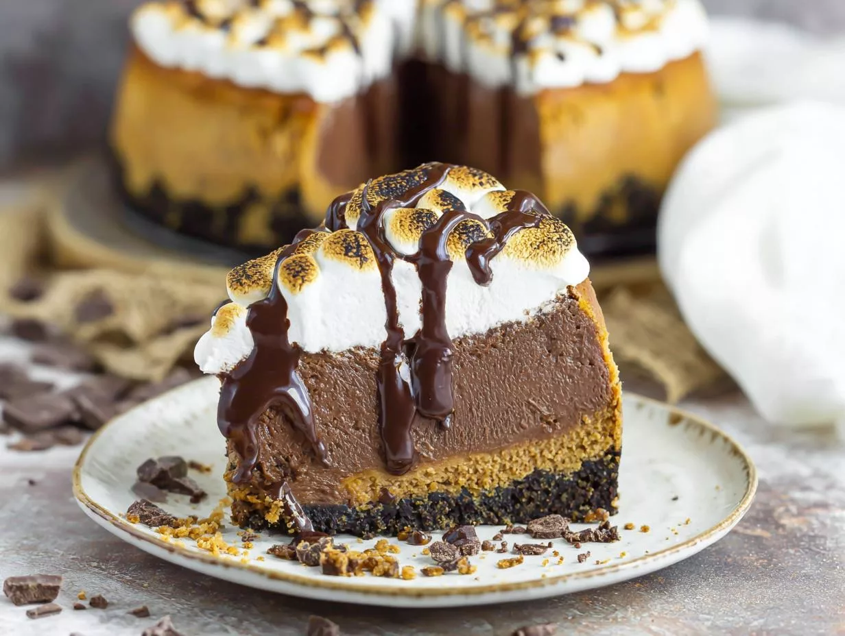 A rich and creamy S’mores Cheesecake with layers of graham cracker crust, chocolate cheesecake filling, marshmallows, and a toasted marshmallow topping.