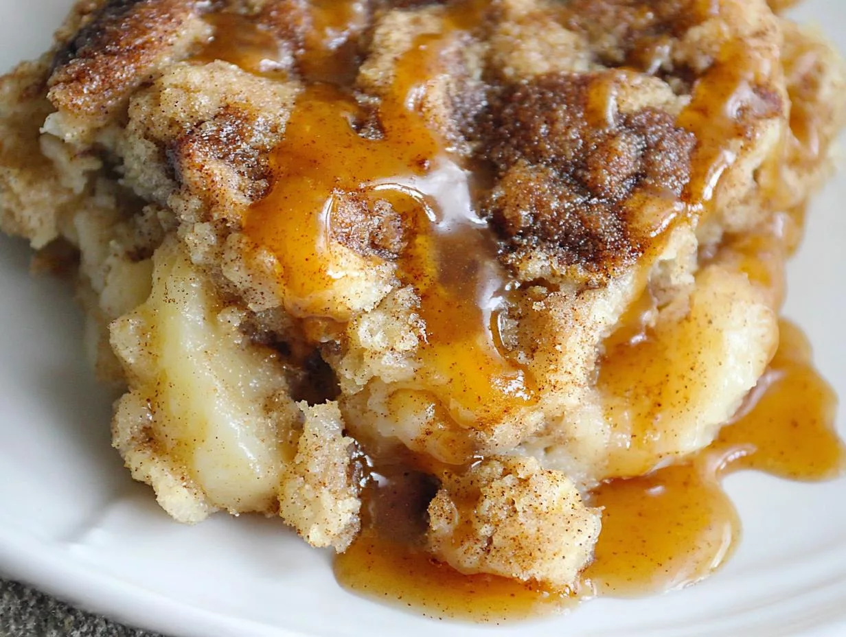A delicious snickerdoodle cobbler featuring layers of cookie dough, apple pie filling, and caramel topping.