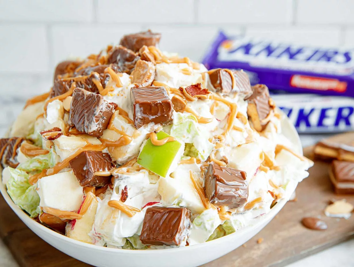 A sweet and crunchy dessert salad featuring Snickers bars, apples, and creamy vanilla pudding.