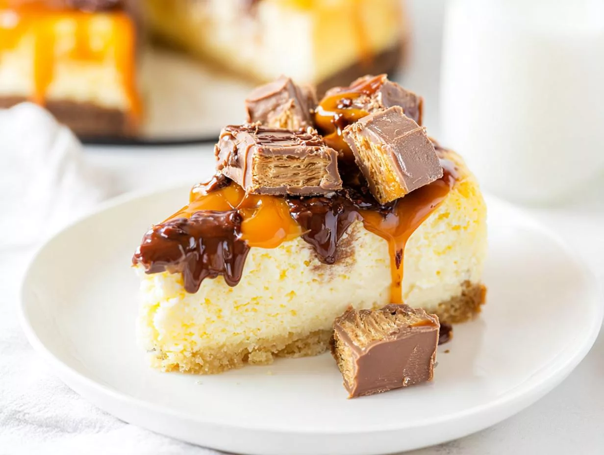 A rich and creamy cheesecake with a shortbread crust, topped with caramel, chopped Twix bars, and a chocolate drizzle.