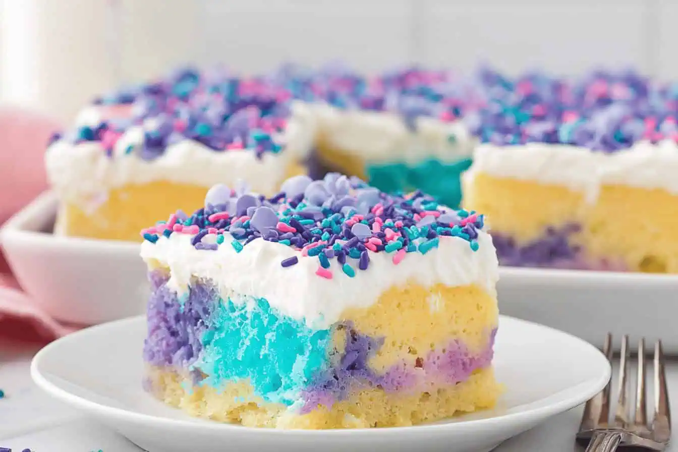 Preheat your oven to 350°F and give a good spray of nonstick baking spray to a 9×13 inch baking dish. You’re gonna want the whole setup ready to roll before mixing anything. In a medium bowl, combine the white cake mix, water, vegetable oil, and egg whites. Grab your handheld mixer and beat on medium speed until there are no lumps left and everything’s smooth. It’s okay if it looks a bit thick but silky — that means you’re on track. Now, split that batter evenly into three bowls. Here’s the fun part: to one bowl, add 3 to 4 drops of blue gel food color and stir until it’s all neon blue (try not to use more or it can get weirdly dark!). In the second bowl, drop 5 to 7 drops of the regal purple gel and blend well. Finally, add 5 to 7 drops of neon pink to the last bowl, stirring until the pink is smooth and streak-free. If it’s a little patchy, just mix a touch more — no stress. Spoon dollops of the blue, purple, and pink batters into your baking dish, alternating colors. Don’t worry about being exact — this is all about fun and whimsy! Use a toothpick or thin skewer to gently swirl the colors together. This can get messy, but it makes the cake look magical… and a little like a unicorn had an explosion in your mixer. Pop the pan in the oven and bake for 25 to 28 minutes. Start checking around 22 minutes by poking a toothpick in the center — it should come out clean or with a few moist crumbs. You want it done but not overbaked, or it gets dry (nobody wants that). Let the cake cool completely in the pan because this is super important for the next step. Once cooled, use the rounded end of a wooden spoon to poke holes all over the cake about an inch apart. Don’t stab too hard or you might break the cake apart. The holes soak up that pudding goodness, so try to make them even. In a large bowl, whisk together the French vanilla pudding mixes and cold whole milk for 2 to 3 minutes on low speed until it thickens nicely. Patience here, don’t rush or you’ll end up with lumps, and lumps are a no-go. Spoon the pudding into each hole, filling them up generously, then spread the rest evenly across the surface with a spatula. Take your time because this is where the magic blends with the cake. Finally, spread the whipped topping evenly over the pudding layer. Try to keep it smooth but a few swirls or peaks make it look homemade and charming. Cover the cake and chill it in the fridge for at least a couple hours, or overnight if you can wait that long — the flavors really come together then.