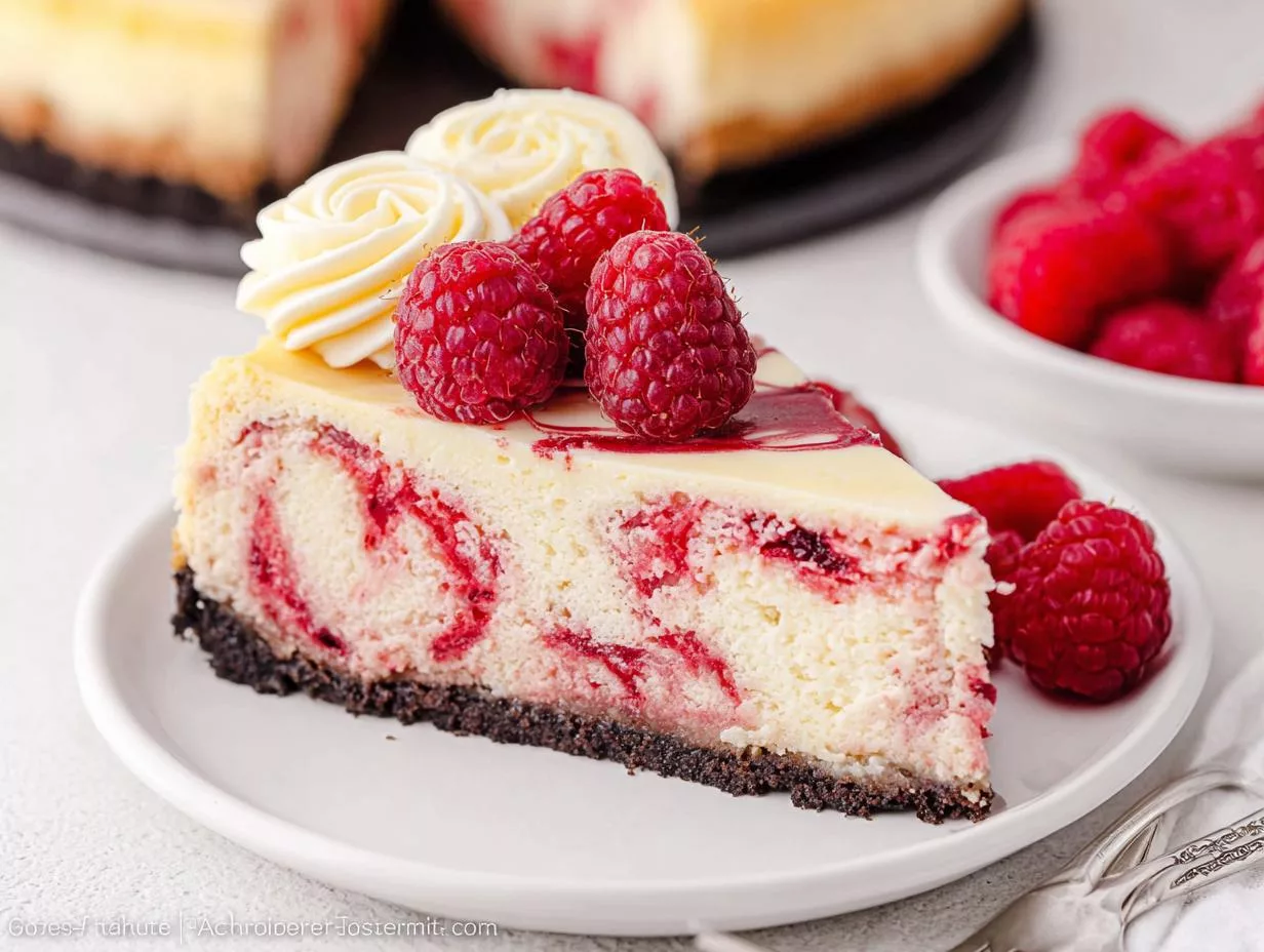 A rich and creamy white chocolate raspberry cheesecake with a chocolate cookie crust and a swirl of raspberry sauce.